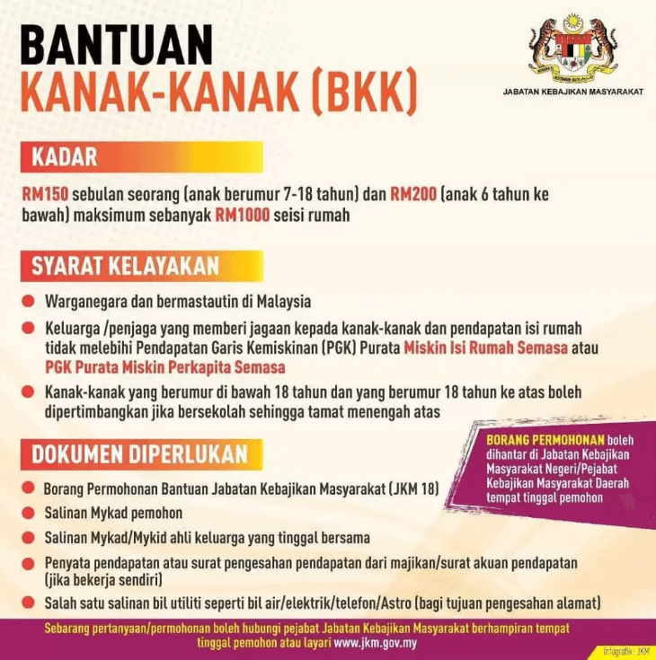 Untuk maklumat lanjut dan permohonan, layari Portal Rasmi Permohonan Bantuan Kanak-Kanak.