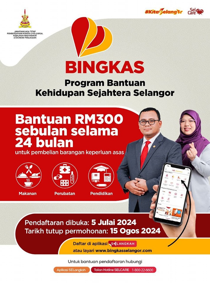 Bantuan Kehidupan Sejahtera Selangor (BINGKAS) merupakan program bantuan bulanan yang sangat bermanfaat untuk 30,000 keluarga layak di negeri Selangor. Dengan nilai RM300 sebulan yang boleh digunakan untuk membeli barangan keperluan asas termasuk barang basah, program ini menawarkan fleksibiliti lebih tinggi berbanding bantuan lain.