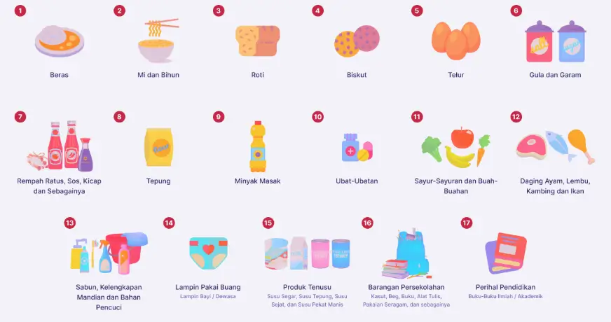 Penerima bantuan BINGKAS mempunyai fleksibiliti untuk membeli pelbagai jenis barangan keperluan asas keluarga:
