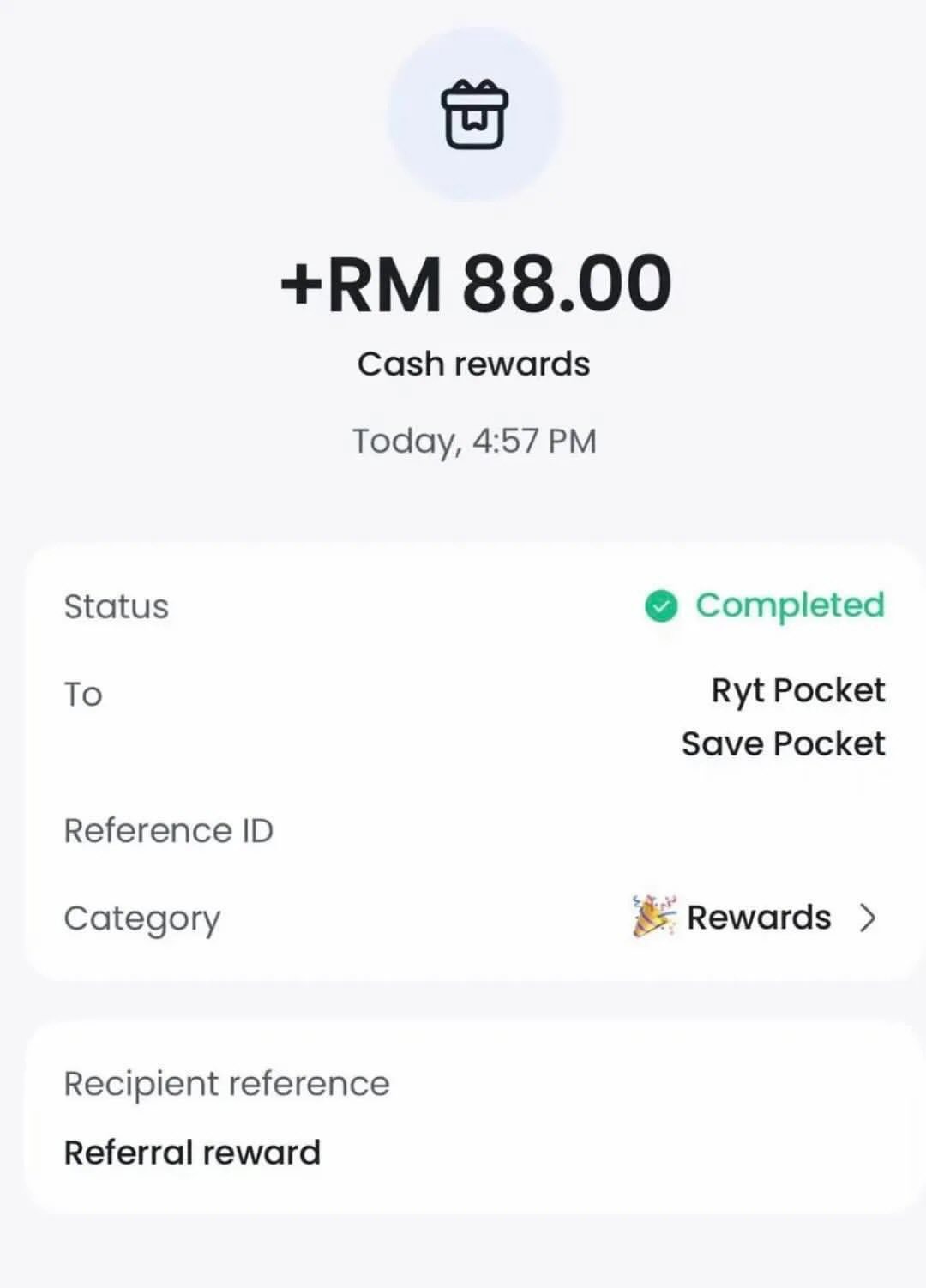 J: Sebaik sahaja proses verifikasi (eKYC) selesai dan akaun diaktifkan, ganjaran akan dikreditkan terus ke Ryt Pocket anda.